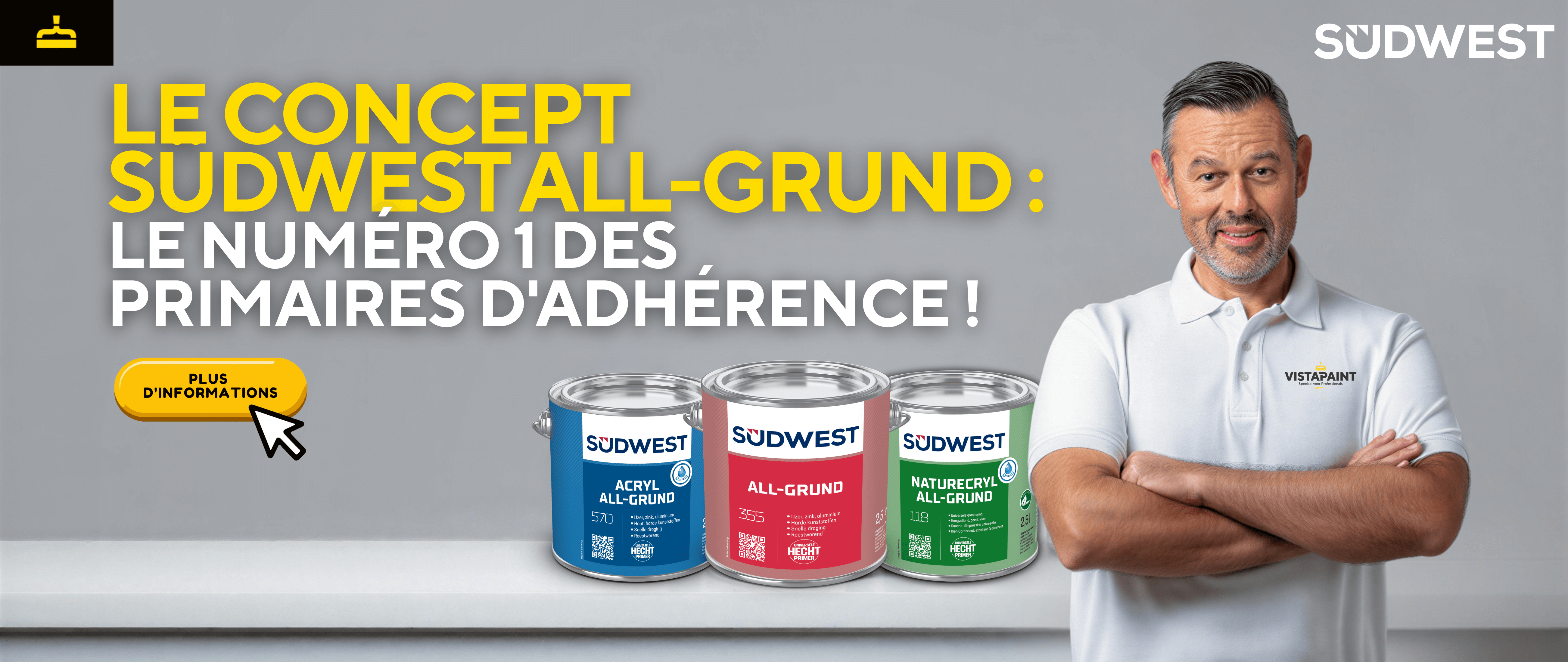 Quand il faut que cela tienne vraiment, tout commence avec le Südwest Acryl All-Grund. Le primaire d’accrochage numéro 1 et la base idéale pour un résultat final parfaitement net. En bonus, avec ce primaire performant, vous bénéficiez pendant tout le mois de février de 20 % DE REMISE à l’achat de 1 × 2,5 litres de Südwest Acryl All-Grund, dans les teintes noir, blanc et gris.